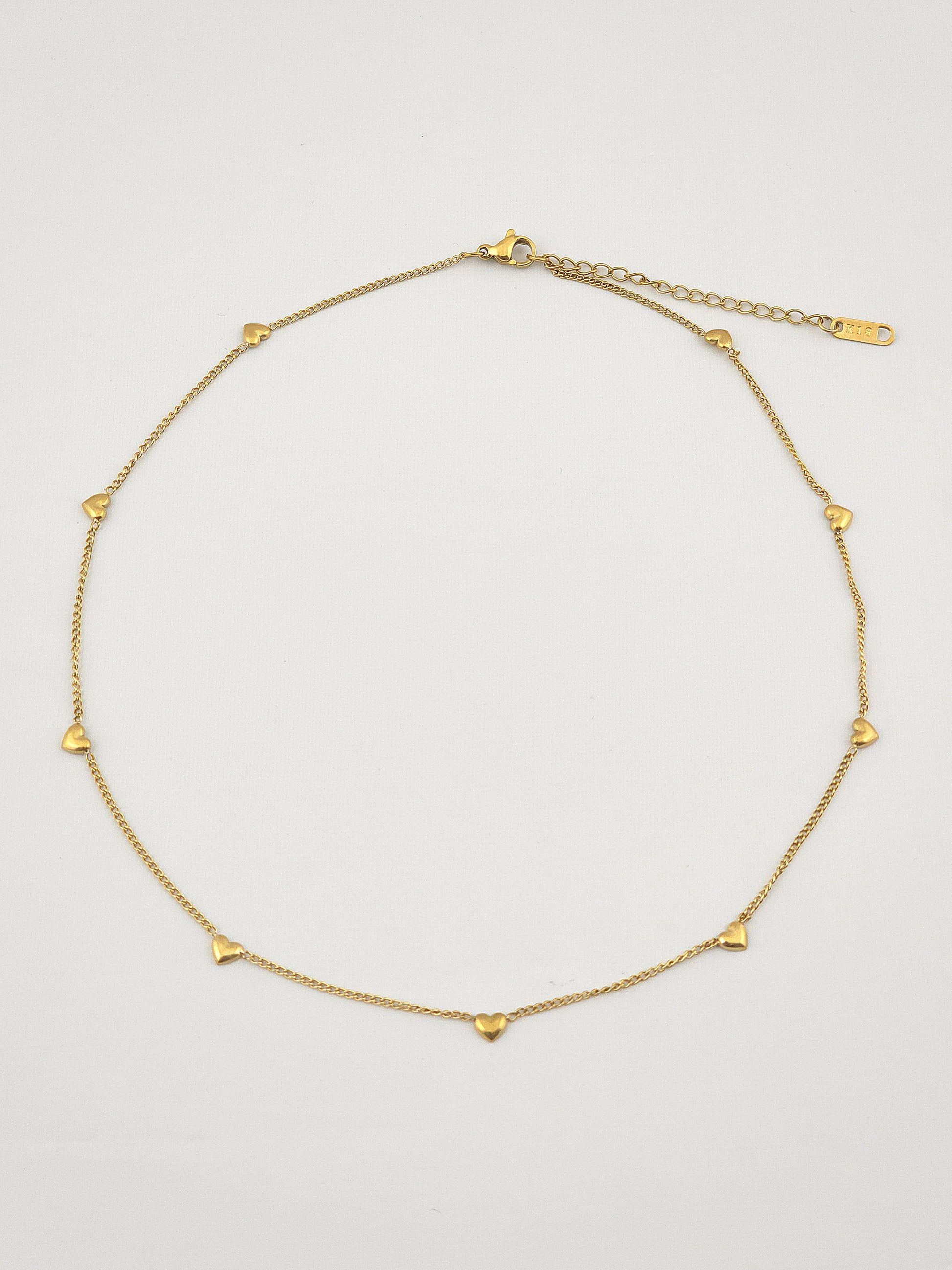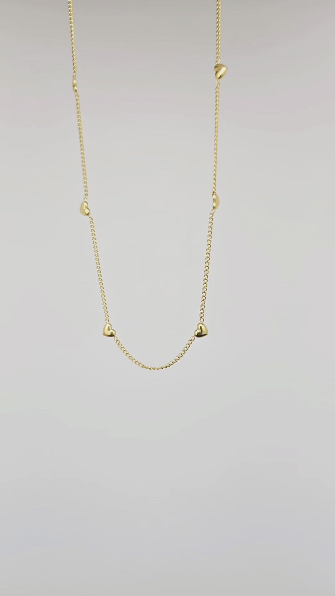 Amour Necklace, a subtle celebration of love's enduring beauty. This elegant piece features a delicate chain adorned with beautiful petite hearts, their golden gleam adding a touch of understated luxury to your everyday style. The Amour Necklace is a timeless piece that effortlessly complements any outfit, making it a perfect choice for the modern woman who appreciates classic design with a touch of romantic charm. Pair with the Amour Bracelet for a complete look.