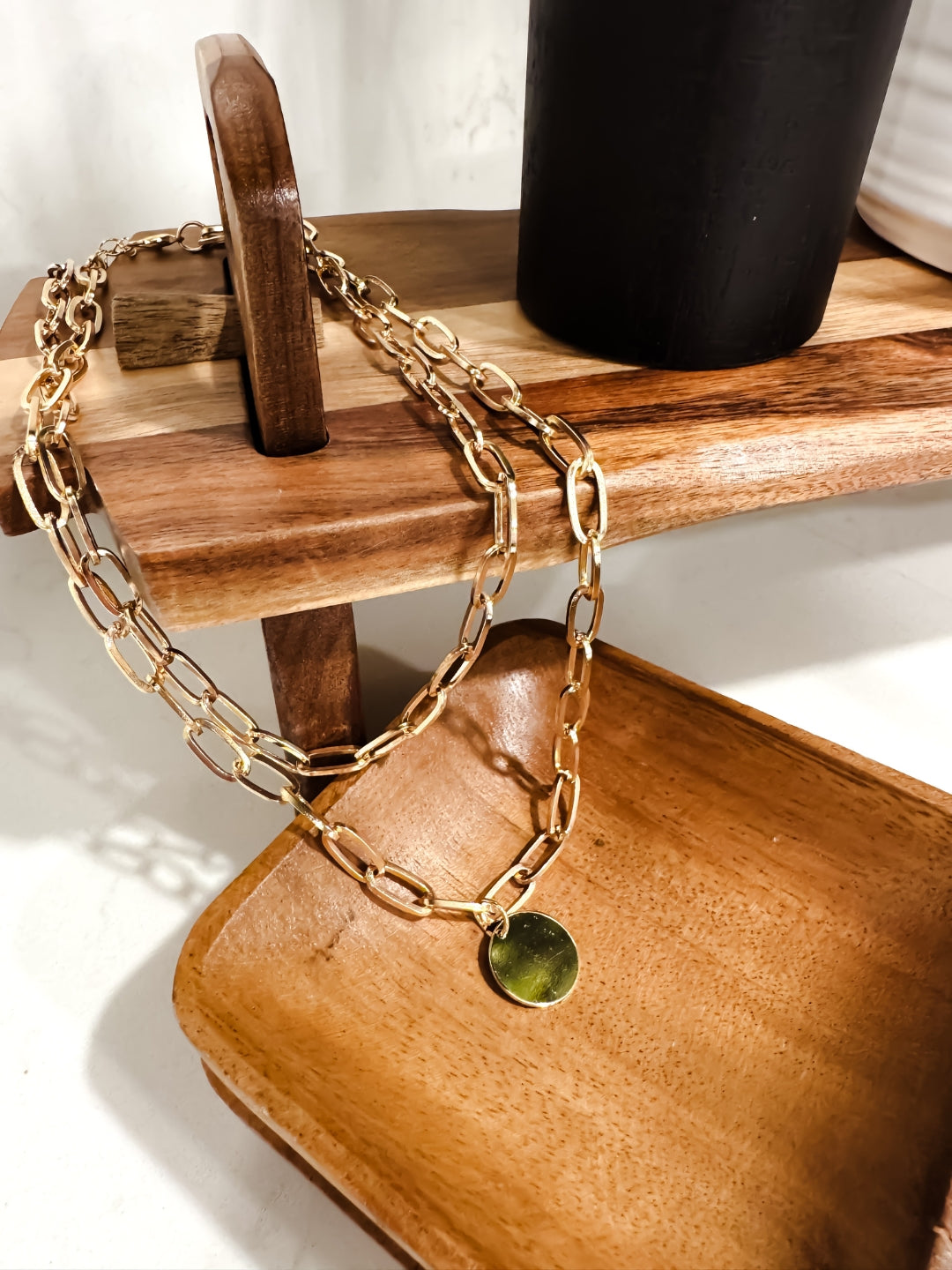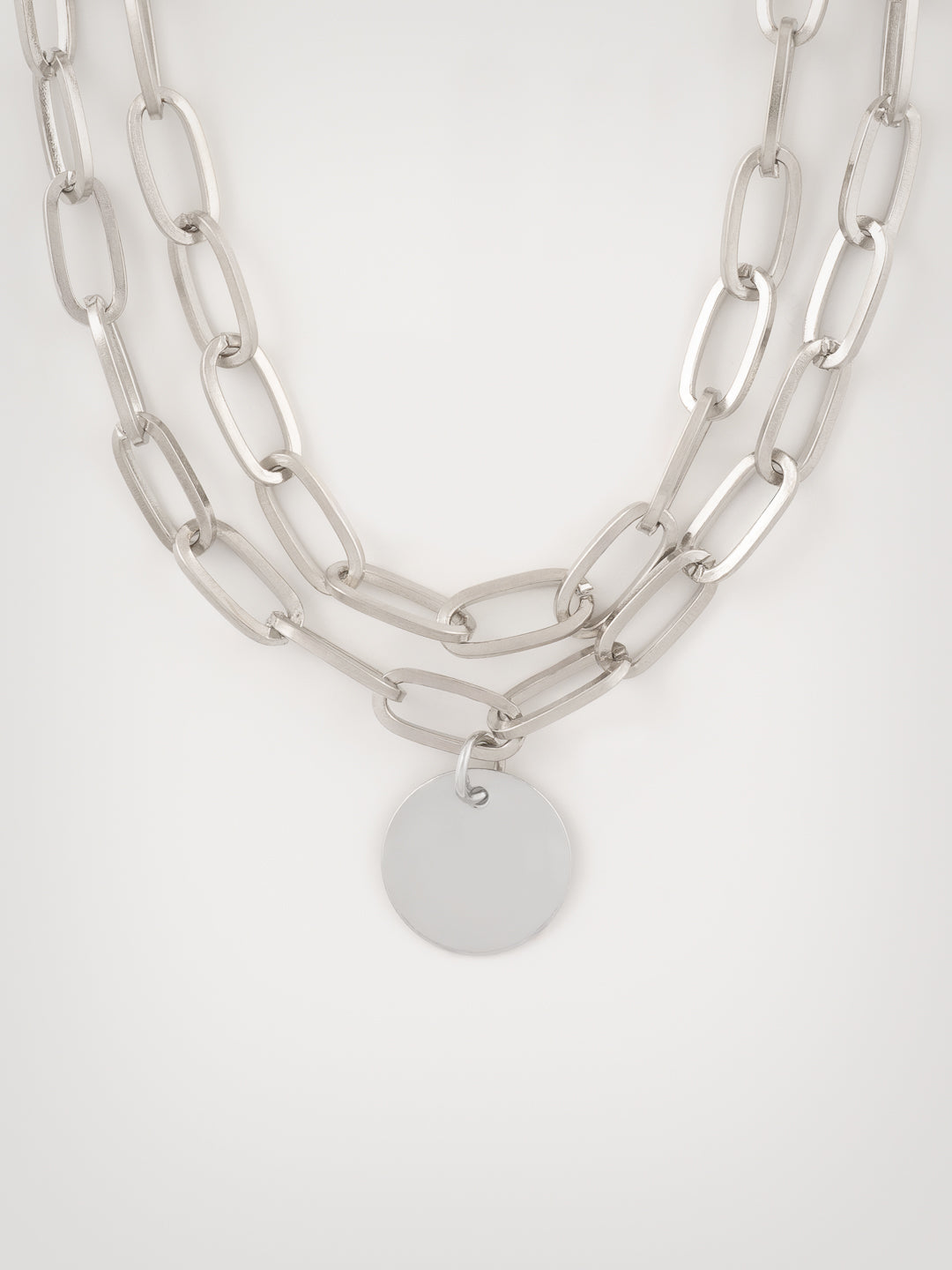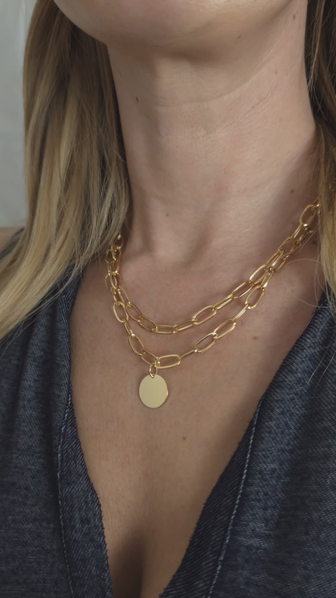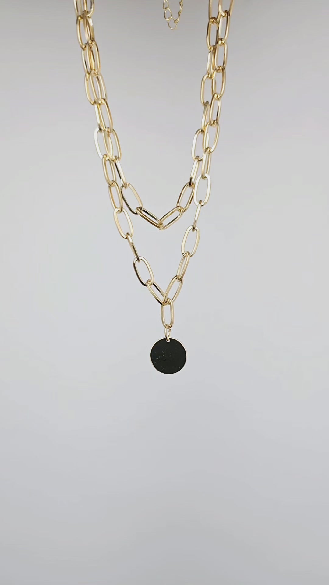 Camille, a necklace that embodies effortless elegance and timeless style. This captivating piece features a graceful cascade of two delicate chains, creating a layered look that flatters the neckline. Wear it long for a dramatic effect, or double it up for a chic, layered look. The gleaming links, reminiscent of shimmering ribbons, culminate in a polished disc pendant that adds a touch of understated sophistication. Camille effortlessly elevates any ensemble, from casual chic to evening glamour.