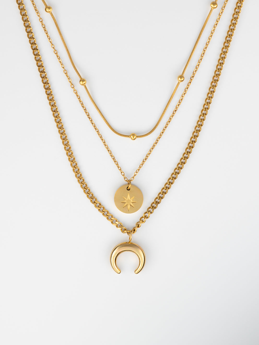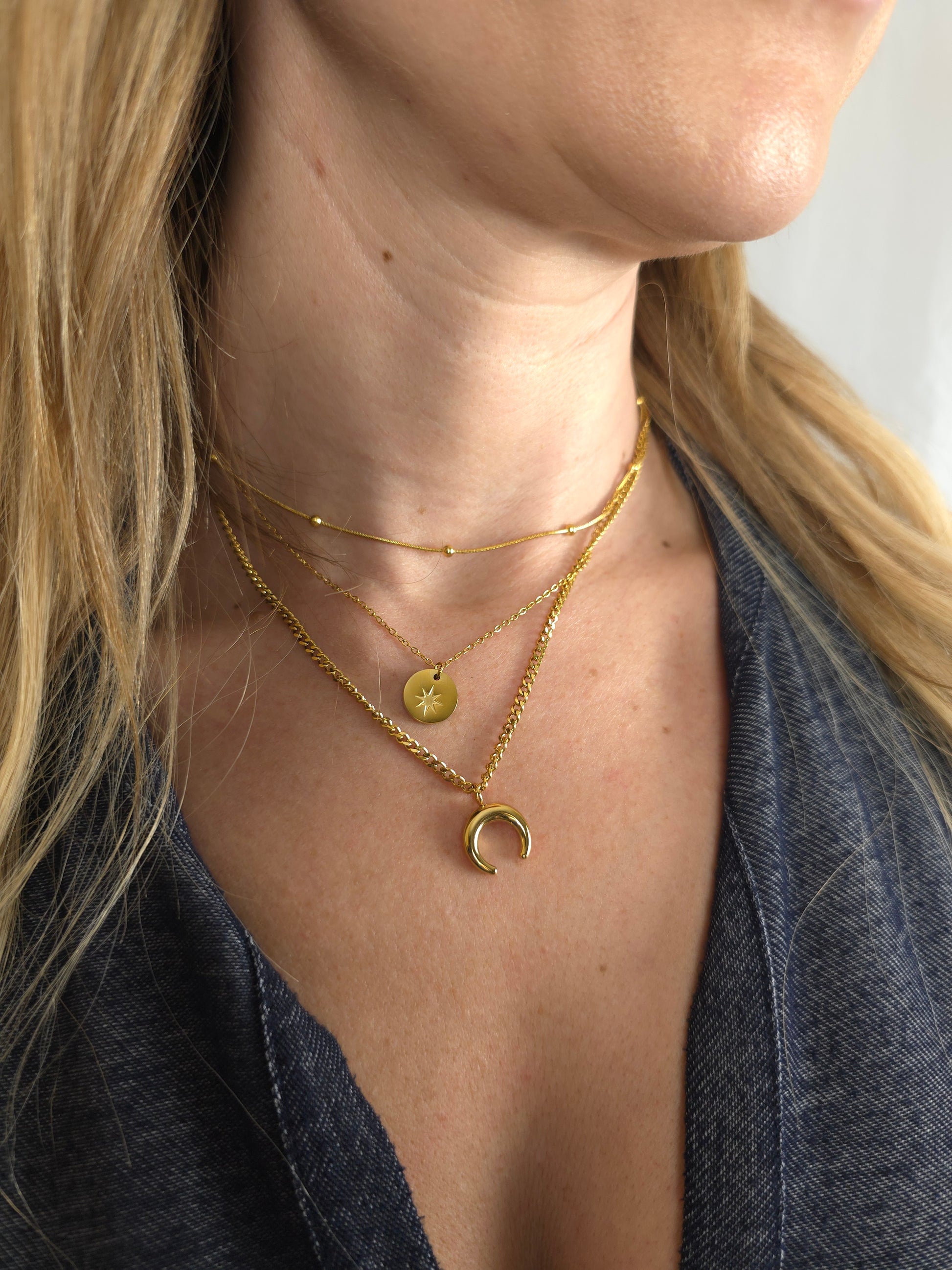 Celeste, a necklace that captures the celestial beauty of the night sky. This enchanting piece features a delicate trio of chains, each adorned with symbolic charms. A gleaming disc evokes the radiant sun, while a graceful crescent moon whispers of lunar magic. Together, they create a harmonious balance, reflecting the celestial dance of day and night. Crafted with meticulous attention to detail and finished in luminous gold, Celeste adds a touch of ethereal elegance to any ensemble.