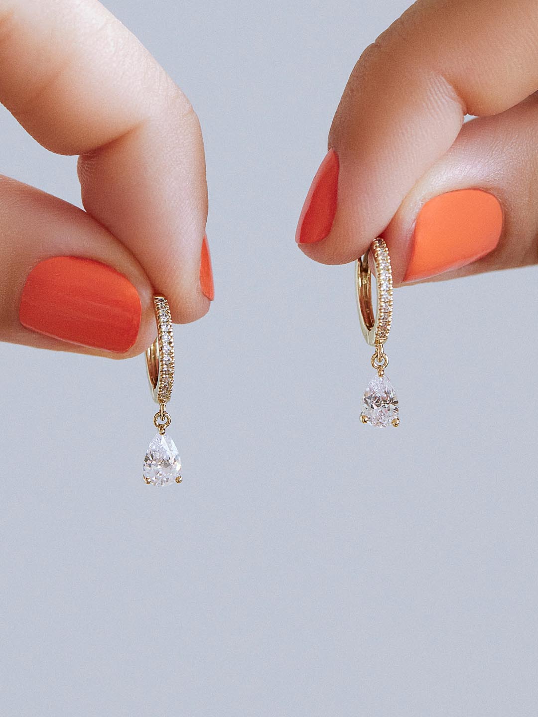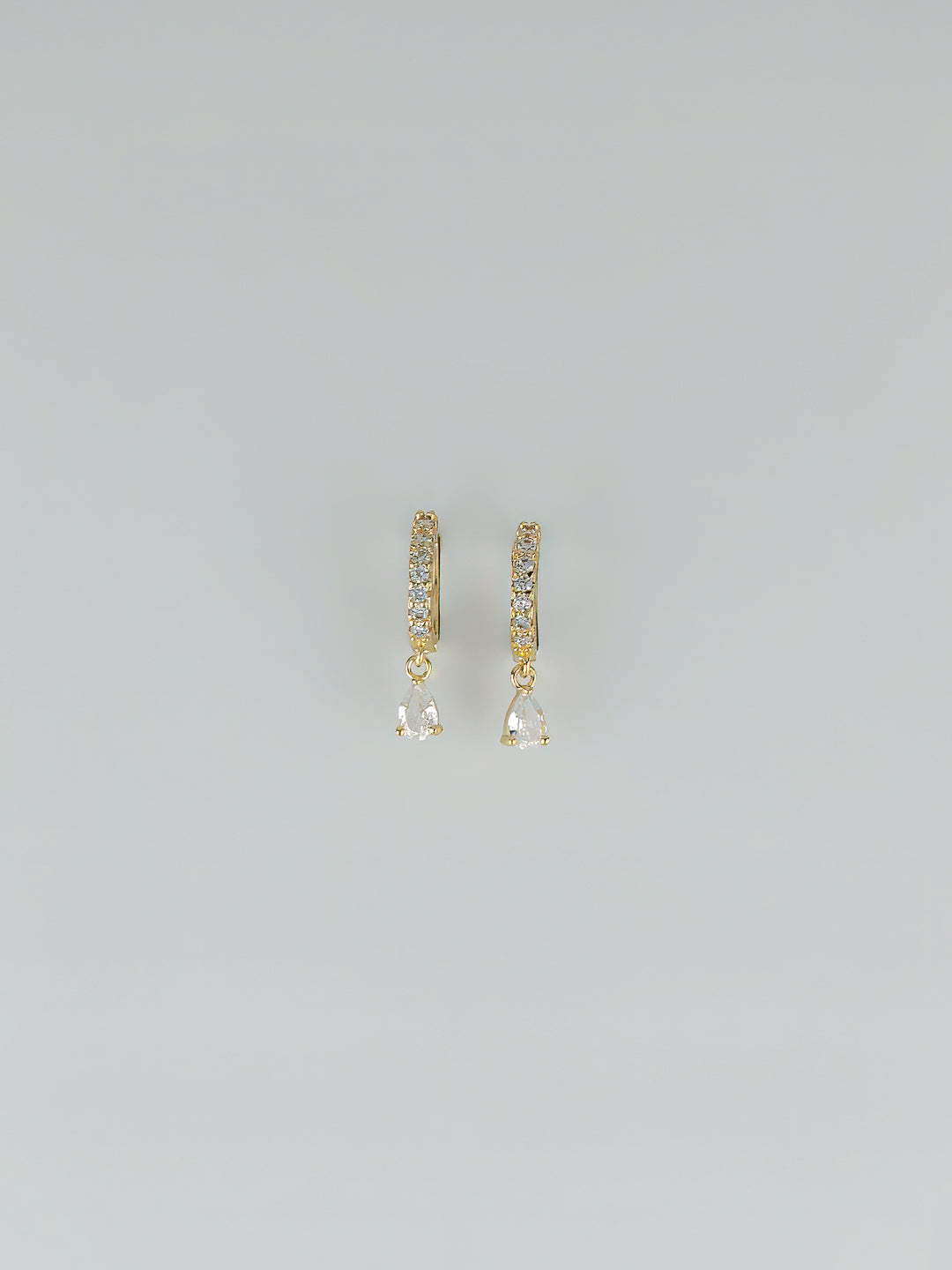 Discover the perfect fusion of huggie and teardrop styles in these exquisite hoops. Adorned with shimmering cubic zirconia gems, they add a touch of understated elegance to any outfit. Lightweight and comfortable for all face shapes, these gold-dipped huggies are a versatile and modern accessory you won't want to miss.