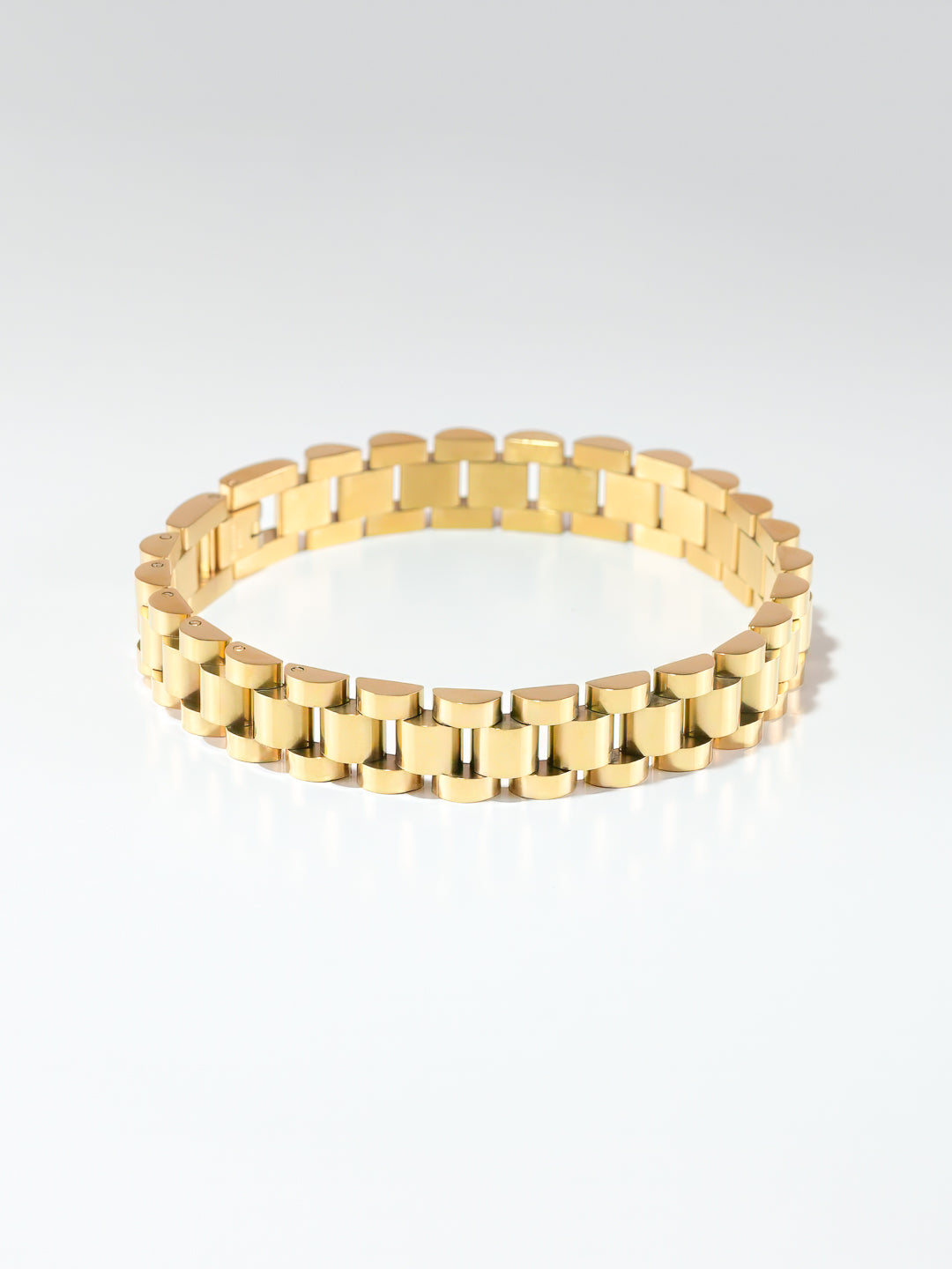 Elevate your timepiece with this exquisite stainless steel watch strap bracelet. Inspired by classic luxury designs, this bracelet adds a touch of sophistication to any outfit. Crafted from hypoallergenic stainless steel and finished with a smooth gold coating, it's perfect for wearing alone or stacking with other bracelets. Discover a new way to express your style with this versatile and stunning accessory.