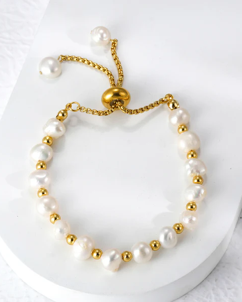 Pearl Glow, a bracelet that speaks of understated elegance and timeless beauty. Luminous freshwater pearls, each one unique in its shape and luster, are interwoven with delicate golden beads, creating a harmonious balance of texture and shine. Pearl Whisper is a delicate treasure, perfect for adding a touch of sophistication to any occasion.