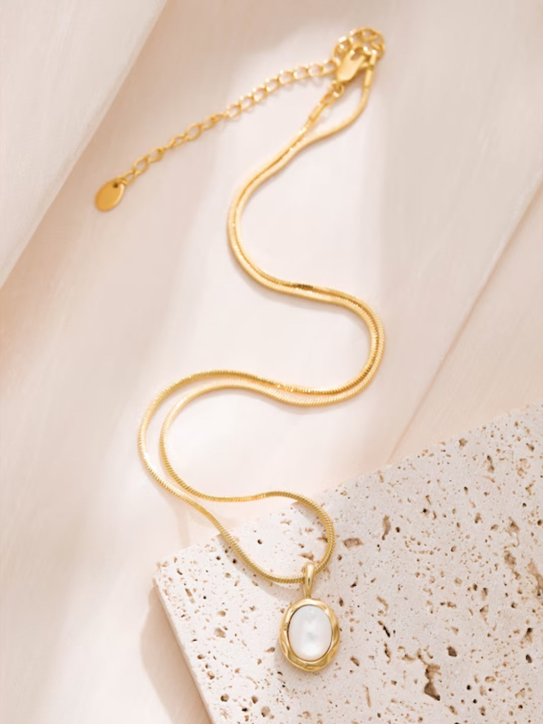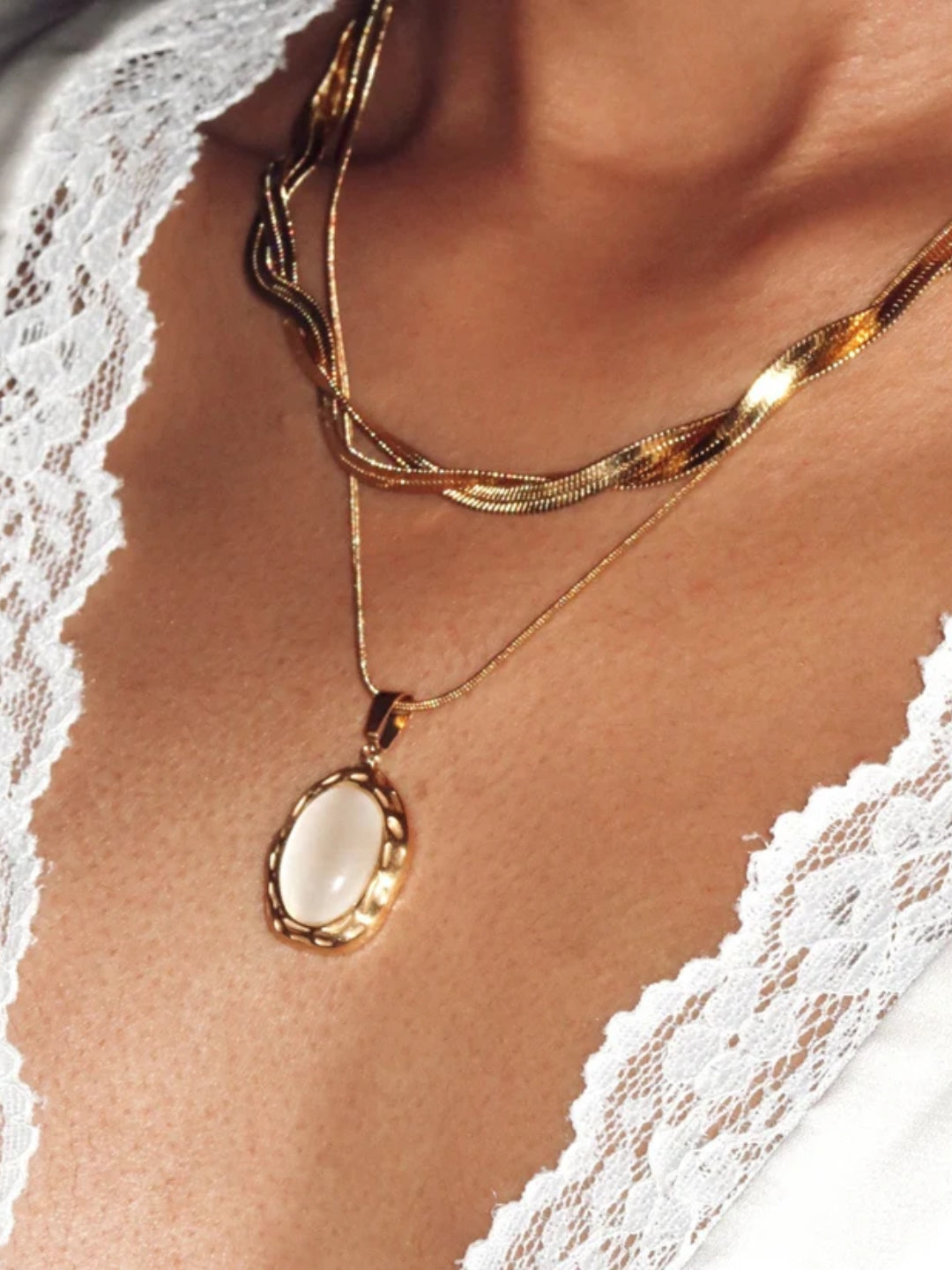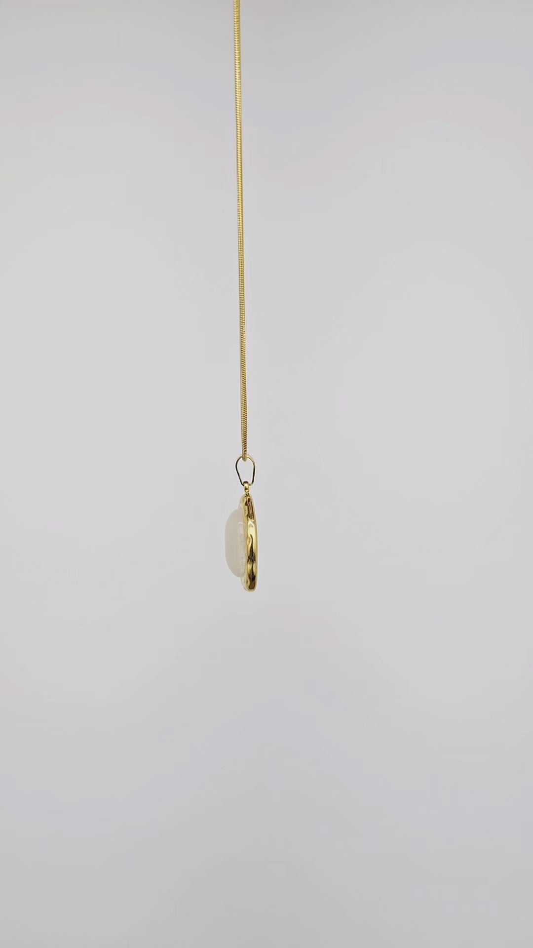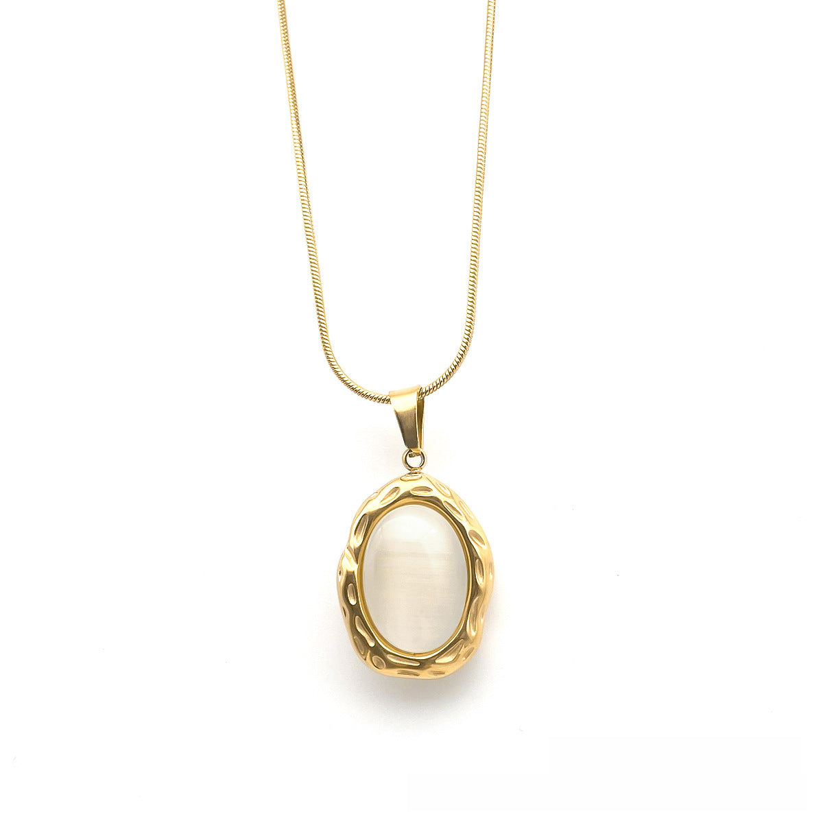 Discover tranquility in the glowing beauty of the Serenity Necklace. This exquisite pendant captures the essence of serenity with its smooth, luminous stone set in a gold-textured embrace. Let this piece be a symbol of balance and elegance, complementing your wardrobe while radiating confidence and poise. With Serenity, you carry grace wherever you go.
